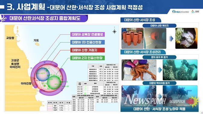 고성군 관계자는 “대문어 산란·서식장의 성공적인 조성과 효율적인 관리를 통하여 안정적인 해양 생태환경 조성은 물론 수산자원 조성으로 어업소득이 증대될 것”이라고 밝혔다.
