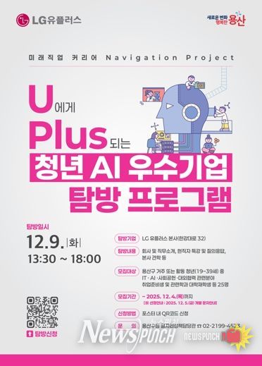 뉴스펀치 김완규 기자 | 서울 용산구는 인공지능(AI)·정보기술(IT) 분야에 관심 있는 청년 취업준비생을 대상으로 LG 유플러스와 함께하는 '미래직업 커리어 Navigation Project - U에게 Plus가 되는 청년 인공지능 우수기업 탐방 프로그램'을 운영한다고 밝혔다.