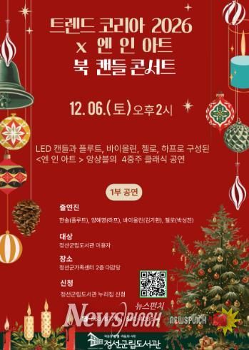 뉴스펀치 김길룡 기자 | 정선군립도서관은 오는 12월 6일 오후 2시, 정선군 가족센터 2층 대강당에서 ‘트렌드 코리아 2026 × 엔 인 아트 북 캔들 콘서트’를 개최한다고 2일 밝혔다.