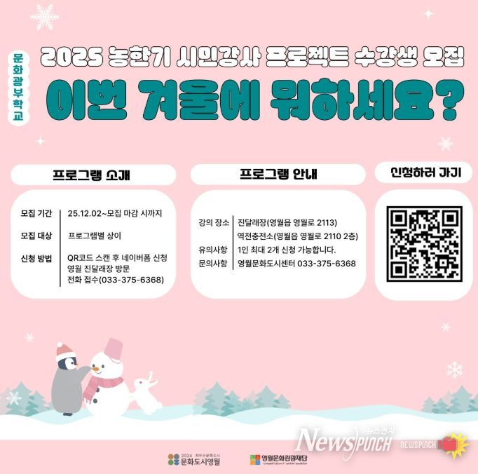뉴스펀치 김길룡 기자 | (재)영월문화관광재단은 2025 문화 광부학교 농한기 시민 강사 프로젝트 수강생을 12월 2일부터 모집한다고 밝혔다.