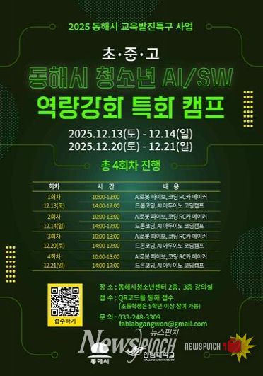 뉴스펀치 김길룡 기자 | 동해시는 교육발전특구 사업의 일환으로 지역 청소년들의 미래기술 역량을 강화하기 위해 한림대학교와 공동주최하는‘청소년 AI·SW 역량강화 특화 캠프(겨울)’를 운영한다.