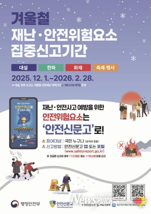 뉴스펀치 김길룡 기자 | 삼척시가 겨울철 발생빈도가 높은 재난·안전 위험요소로부터 시민의 안전을 확보하기 위해 2025년 12월 1일부터 2026년 2월 28일까지 3개월간 ‘겨울철 재난·안전 집중신고제’를 운영한다.