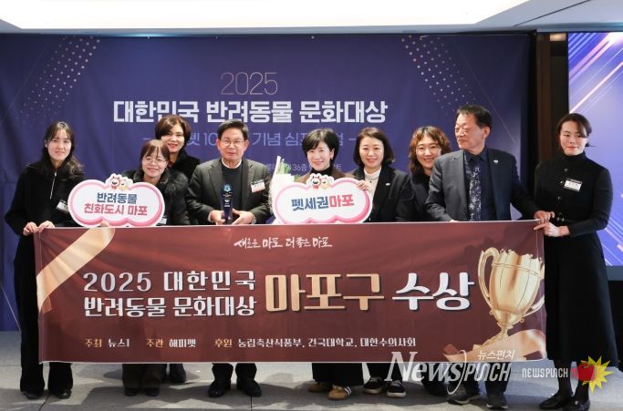 뉴스펀치 김완규 기자 | 마포구는 12월 3일 오후 1시, 중구 소공동 롯데호텔 36층 벨뷰스위트에서 열린 ‘2025 대한민국 반려동물 문화대상’ 시상식에서 문화체육관광위 위원장상을 수상했다.