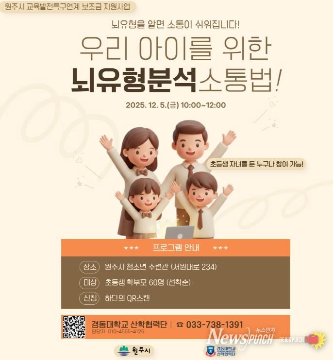 첫 번째 프로그램은 ‘뇌유형 분석을 통한 자녀와의 소통법’ 특강이다. 초등학생 학부모를 대상으로 5일 오전 10시 원주시 청소년수련관에서 열린다. 특강에서는 자녀의 뇌 인지 특성과 행동 패턴을 이해하도록 돕고, 효과적인 맞춤형 대화 전략을 제공할 예정이다.