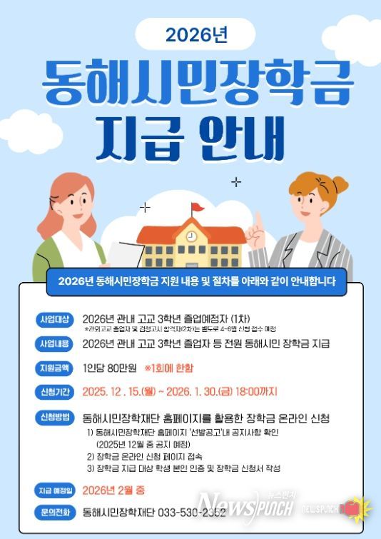 뉴스펀치 김길룡 기자 | (재)동해시민장학재단은 지난달 개최한 제2차 이사회에서 2026년 관내 고교 졸업생 전원에게 1인당 80만 원의 장학금을 지급하기로 결정했다고 밝혔다.