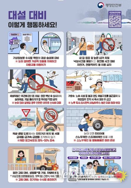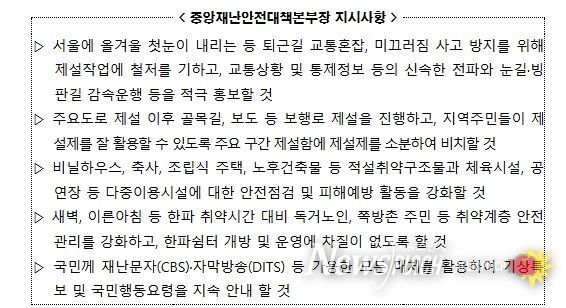아울러, 국민께서도 기상정보를 수시로 확인하고, 주간 시간대 안전한 상황에서 제설작업을 실시하는 등 국민행동요령을 준수해 주실 것을 당부했다.