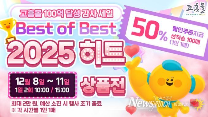 뉴스펀치 김길룡 기자 | 고흥군은 직영 온라인 농수축특산물 쇼핑몰 ‘고흥몰’이 누적 매출 100억 원 돌파를 기념해 오는 1월 8일부터 11일까지 ‘100억 달성 감사 세일–2025 Best of Best’ 기획전을 진행한다고 밝혔다.