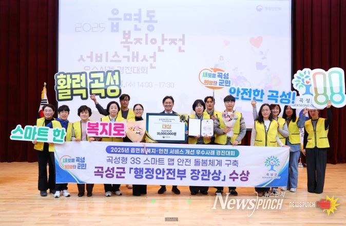 뉴스펀치 김길룡 기자 | 전남 곡성군은 지난 3일 행정안전부가 실시한 ‘2025년 읍면동 복지·안전 서비스 개선’ 우수사례 경진대회에서‘곡성형 3S 스마트맵 안전돌봄 체계 구축 사업’이 대상을 받았다고 8일 밝혔다.
