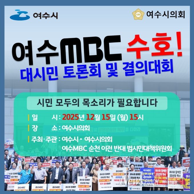 뉴스펀치 김길룡 기자 | 여수시의회에 따르면, 여수시·여수시의회와 시민사회단체로 구성된 여수MBC 순천이전 반대 범시민대책위원회는 오는 12월 15일 오후 3시, 여수시의회 청사 1층 공감뜨락에서 ‘여수MBC 지키기! 대시민 토론회 및 결의대회’를 개최한다.