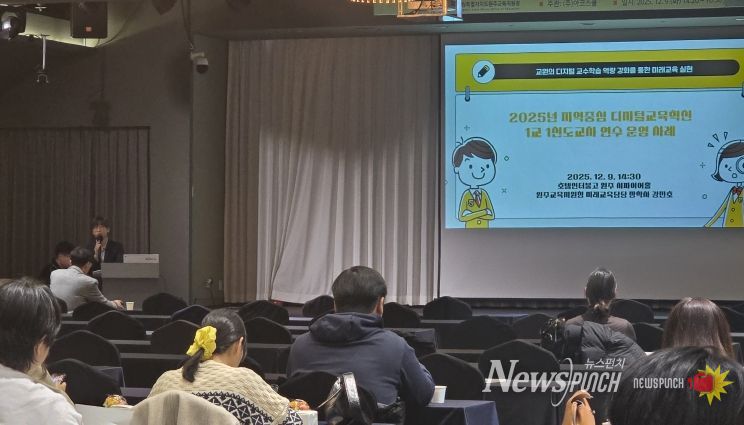 뉴스펀치 김길룡 기자 | 원주교육지원청은 12월 9일 호텔인터불고 원주에서 ‘2025년 지역중심 디지털 교육혁신 1교 1선도교사 연수 성과 나눔회’를 개최했다.