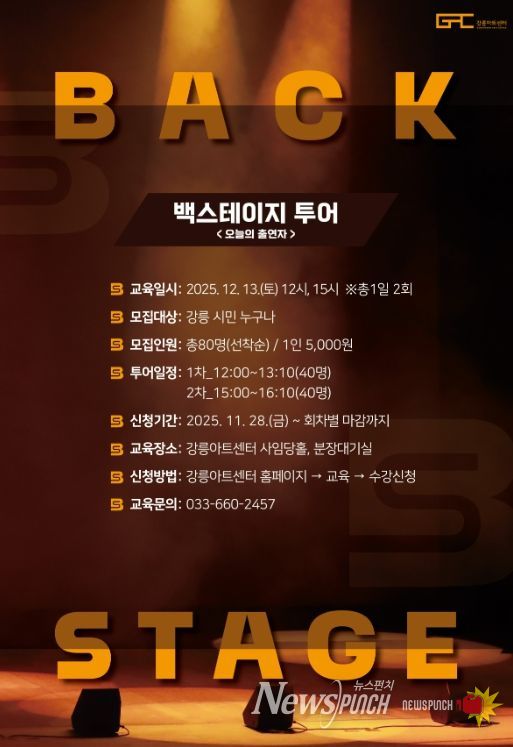뉴스펀치 김길룡 기자 | 강릉아트센터는 오는 13일, 공연장의 무대 뒤를 시민에게 개방하는 체험예술교육 프로그램 〈백스테이지 투어: 오늘의 출연자〉를 개최한다.