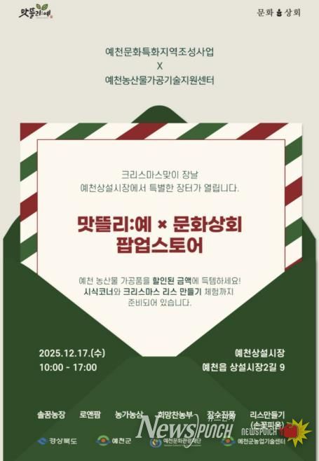 뉴스펀치 김길룡 기자 | 예천군과 예천문화관광재단은 17일, 예천상설시장 ‘문화상회’에서 크리스마스를 맞아 ‘문화상회 X 맛뜰리:예’ 프로그램을 개최한다.