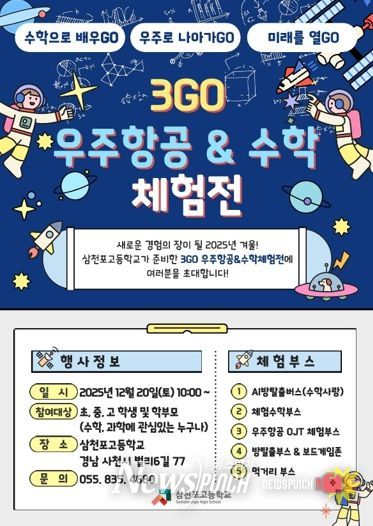 뉴스펀치 김길룡 기자 | 삼천포고등학교는 오는 12월 20일 오전 10시부터 교내에서 ‘3GO 우주항공&수학 체험전’을 개최한다.