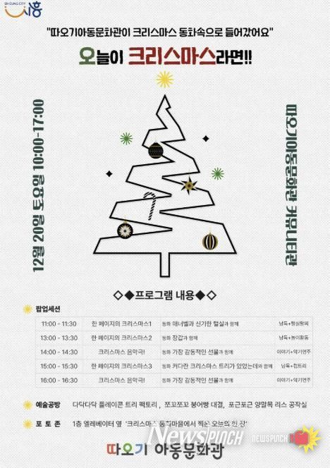 뉴스펀치 김길룡 기자 | 시흥시 따오기아동문화관이 오는 12월 20일 크리스마스 문화행사 ‘오늘이 크리스마스라면’을 연다. 반짝이는 트리, 서늘한 겨울 공기, 책장을 넘기는 소리가 한데 어우러지며 문화관은 잠시 ‘이야기가 살아 움직이는 공간’으로 변한다.