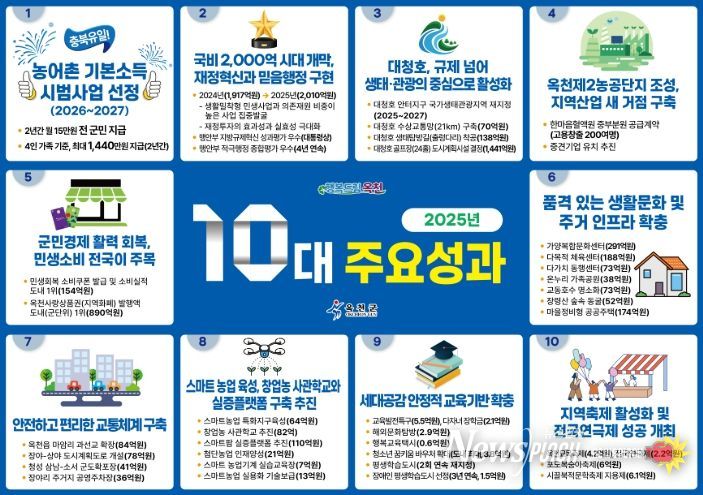 뉴스펀치 김길룡 기자 | 옥천군은 15일 ‘2025년 옥천군 10대 주요성과’를 공식 발표하며 금년 군정 운영의 가시적 성과를 대내외에 밝혔다.