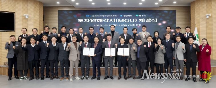 뉴스펀치 김길룡 기자 | 경상북도와 영주시는 15일 영주시청 강당에서 이철우 경상북도지사, 유정근 영주시장 권한대행, 임종득 국회의원, 박성만 경북도의회 의장, 김병기 영주시의회 의장, 정정모 ㈜코리아디펜스인더스트리 대표 등 20여 명이 참석한 가운데 ㈜코리아디펜스인더스트리와 경상북도·영주시 간 투자양해각서(MOU)를 체결했다.