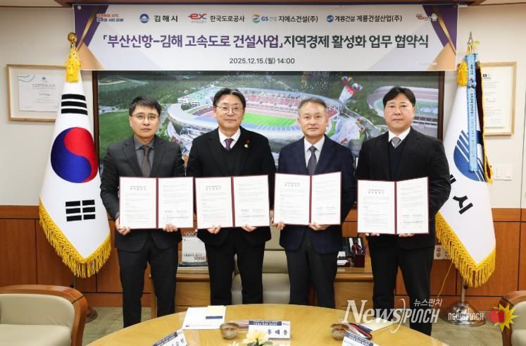 뉴스펀치 김길룡 기자 | 김해시는 15일 오후 2시 시장실에서 한국도로공사, 지에스건설(주), 계룡건설산업(주)과 함께 부산신항~김해 고속도로 건설사업의 지역경제 활성화 업무협약(MOU)을 체결했다.