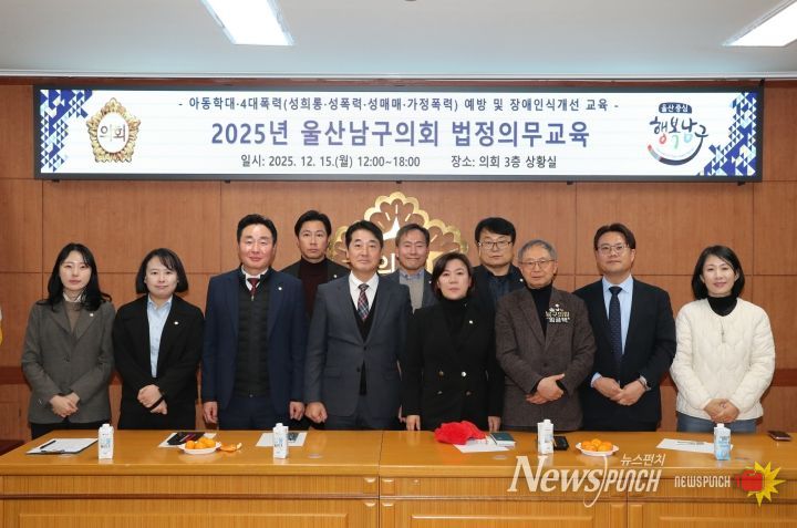 뉴스펀치 김길룡 기자 | 울산 남구의회는 15일 3층 회의실에서 의원 전원과 의회사무국 직원들을 대상으로 2025년도 법정의무교육을 실시했다.