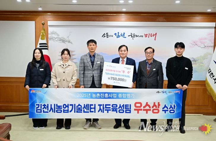 뉴스펀치 김길룡 기자 | 김천시농업기술센터 자두육성팀이 경상북도농업기술원에서 주관한 ‘2025년 농촌진흥사업 우수팀 선정’에서 우수상을 수상했다.