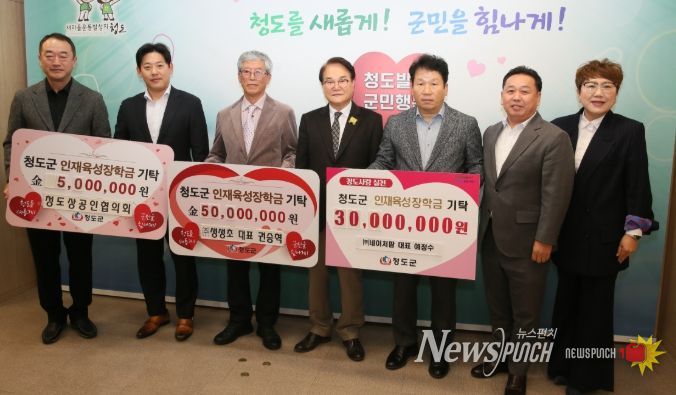 뉴스펀치 김길룡 기자 | 청도군(군수 김하수)은 지난 15일 청도상공인협의회와 회원들로부터 인재육성장학금 총 8,500만원을 기탁받았다고 밝혔다.