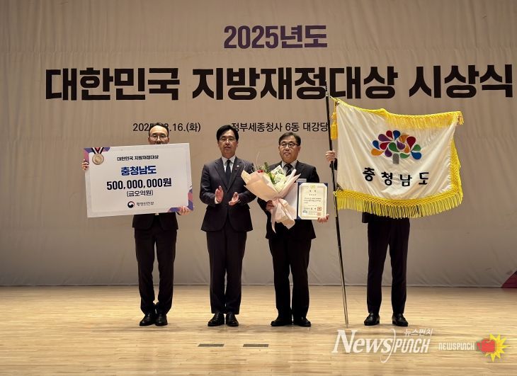 뉴스펀치 김길룡 기자 | 충남도는 16일 정부세종청사 대강당에서 열린 ‘2025년 대한민국 지방재정대상 시상식’에서 국무총리상을 받아 재정 인센티브 5억 원을 확보했다.