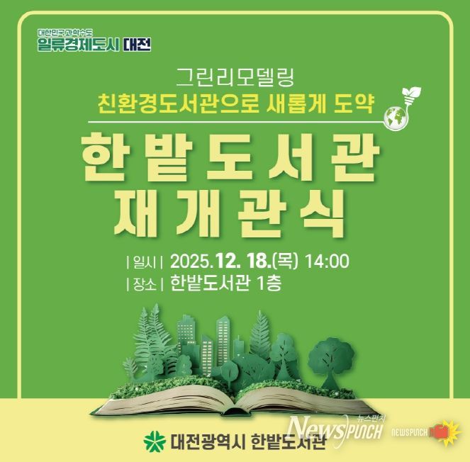 뉴스펀치 김길룡 기자 | 한밭도서관은 그린리모델링을 완료하고 친환경 독서문화공간으로 새롭게 단장해 18일 오후 2시 재개관 기념식을 개최한다.