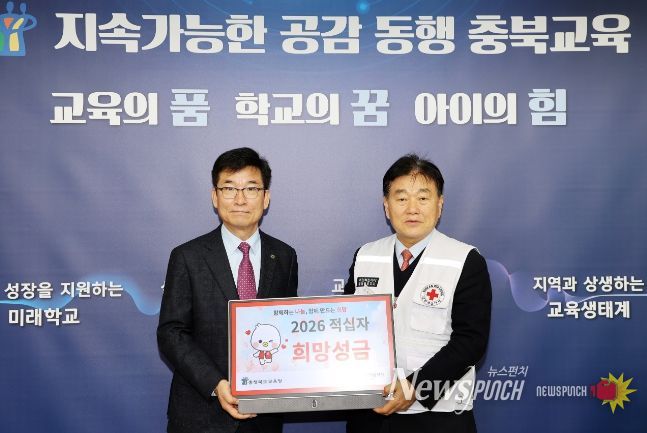 뉴스펀치 김길룡 기자 | 충청북도교육청은 17일, 교육감실에서 대한적십자사 충북지사(회장 장현봉)에 2026년 적십자 특별회비를 전달했다.