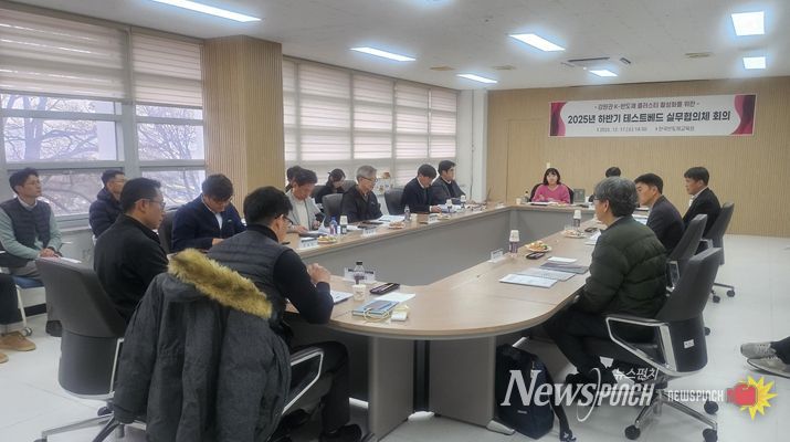 뉴스펀치 김길룡 기자 | 강원특별자치도는 12월 17일 한국반도체교육원(원주)에서 강원특별자치도, 원주시, 강원테크노파크, 한국기계전기전자시험연구원(KTC), 강원대학교, 연세대학교 미래캠퍼스 등 각 사업의 주관기관이 참여하는 '2025년 강원권 반도체 테스트베드 실무협의체' 회의를 개최했다.
