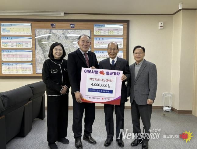뉴스펀치 김길룡 기자 | 대한노인회 홍성읍분회는 지난 17일 홍성읍 행정복지센터를 방문해 ‘희망2026 이웃돕기 성금’으로 400만 원을 기탁하며 지역사회에 따뜻한 나눔을 실천했다.