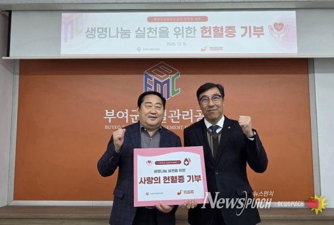 뉴스펀치 김길룡 기자 | 부여군시설관리공단은 임직원들이 자발적으로 모은 헌혈증 84매를 대한산업보건협회 한마음혈액원에 기부하며 지역사회 생명 나눔 활동에 동참했다고 18일 밝혔다.