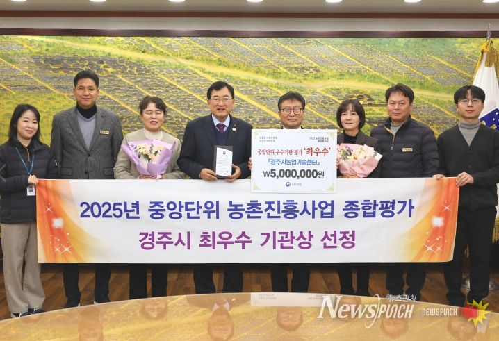 뉴스펀치 김길룡 기자 | 경주시는 농촌진흥사업 전반에서의 우수한 성과를 인정받아 지난 4일 농촌진흥청에서 열린 '2025년 농업과학기술 성과공유대회'에서 농촌진흥사업 종합평가 ‘최우수상’을 수상했다고 밝혔다.