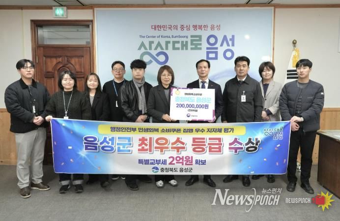 뉴스펀치 김길룡 기자 | 음성군은 행정안전부가 주관한 ‘2025년 민생회복 소비쿠폰 집행 평가’에서 기초자치단체 부문 최고등급(가등급)으로 선정돼 특별교부세 2억 원을 확보했다고 18일 밝혔다.