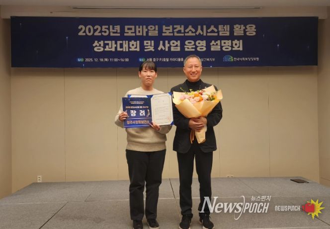 뉴스펀치 김길룡 기자 | 청주시 청원보건소는 18일 서울 중구 호텔PJ에서 열린 ‘2025년 모바일 보건소 활용 성과대회’에서 모바일 보건소 시스템 활용 우수기관으로 선정돼 사회보장정보원장 표창을 수상했다.