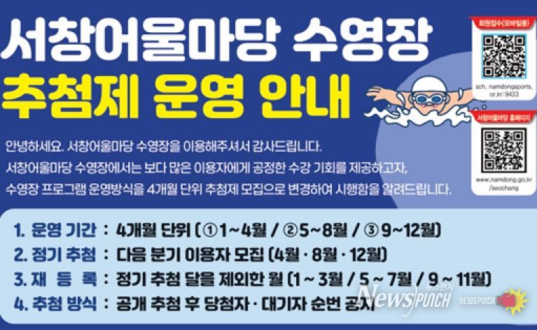 뉴스펀치 김길룡 기자 | 인천시 남동구 도시관리공단은 주민들이 공평하게 시설을 이용할 수 있도록 서창어울마당 수영장 운영을 기존 선착순 방식에서 추첨제로 전환한다고 19일 전했다.