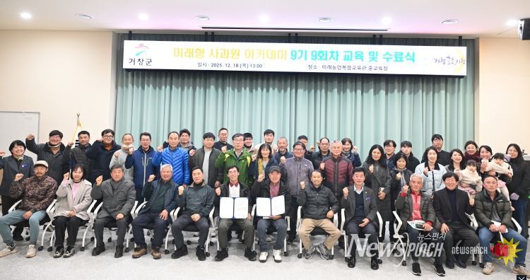 뉴스펀치 김길룡 기자 | 거창군은 지난 18일 농업기술센터 미래농업복합교육관 2층 중교육장에서 49명의 교육생이 참석한 가운데 ‘미래형 사과원 아카데미 9기’ 수료식을 개최했다.