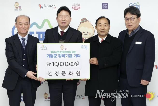 뉴스펀치 김길룡 기자 | 가평군 인재양성을 위한 따뜻한 나눔이 이어지고 있다. 선경문화원은 최근 가평군청을 방문해 가평지역 교육 발전을 위해 장학금 1,000만원을 기탁했다. 이 자리에는 오순탁 선경문화원 세계화본부장도 함께해 별도로 장학금 1,000만원을 전달했다. 이들은 지난해에 이어 올해도 가평지역 인재양성에 동참했다.