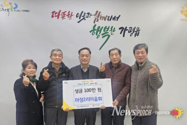 뉴스펀치 김길룡 기자 | 가평군 가평읍 마장2리 마을회는 최근 행정복지센터를 방문해 취약계층 이웃을 돕기 위한 성금 100만 원을 전달했다.