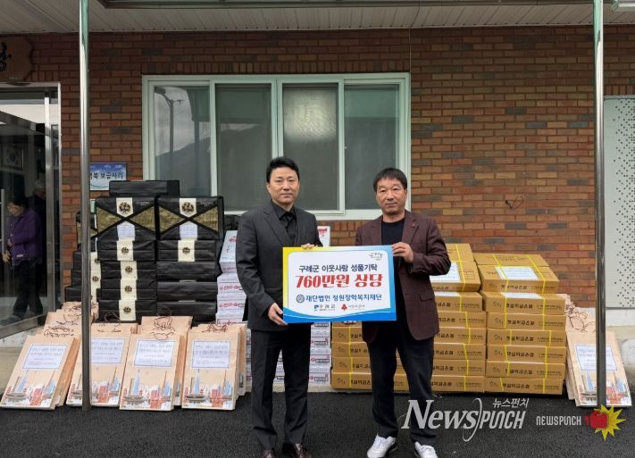 뉴스펀치 김길룡 기자 | 전남 구례군은 12월 19일, (재)정원장학복지재단(이사장 김용만)에서 토지면 신촌마을 주민과 관내 가정위탁세대를 위해 쌀(20kg), 돼지고기 세트, 생필품 세트, 라면 등 총 760만 원 상당의 물품을 전달했다고 밝혔다.