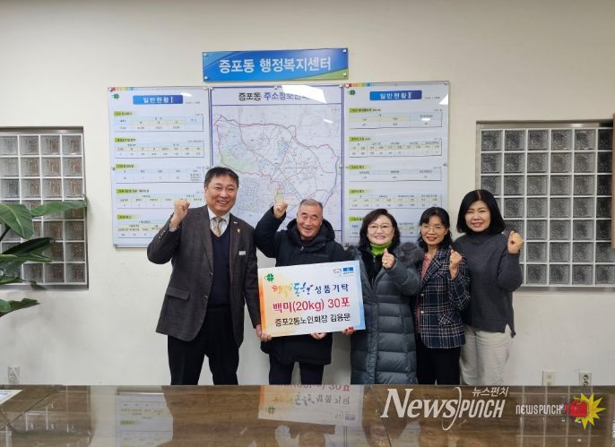뉴스펀치 김길룡 기자 | 이천시 증포동은 지난 12월 19일 증포동행정복지센터에서 증포2통 노인회 김용문 회장이 관내 취약계층을 위해 백미(20kg) 30포를 기탁했다고 밝혔다.