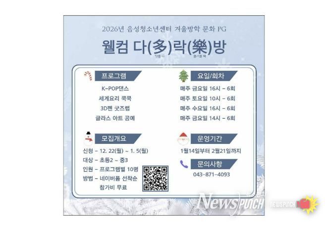 뉴스펀치 김길룡 기자 | 음성청소년센터는 겨울방학 프로그램으로 ‘웰컴 다락방’을 운영한다고 밝혔다.