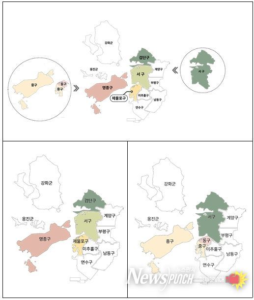 인천형 행정체제 개편은 현재의 중구와 동구를 ‘제물포구’와 ‘영종구’로 통합·조정하고, 서구에서 ‘검단구’를 분리하는 것으로, 인천의 행정체제를 기존 2군·8구에서 2군·9구로 확대하는 사업이다.