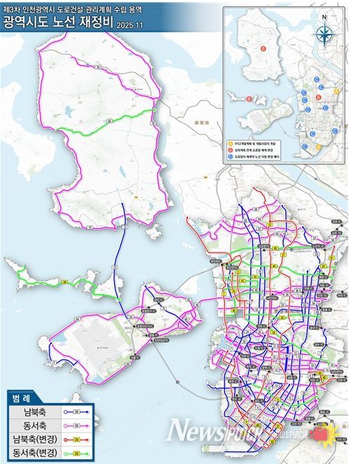 뉴스펀치 김길룡 기자 | 인천광역시는 12월 22일 송도·청라경제자유구역 및 계양 테크노밸리(TV) 개발계획, 고속도로 건설 및 교통혼잡도로 개선사업계획 등 국가 상위계획을 반영해 광역시도 노선 체계를 재정비하여 고시한다고 밝혔다.