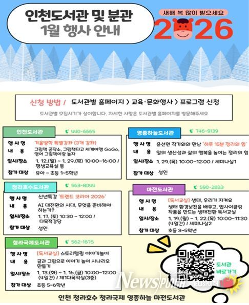 한수미 시 인천도서관장은 “새해를 맞아 시민들이 도서관에서 독서와 배움을 통해 의미 있는 시간을 보낼 수 있도록 다양한 특강을 준비했다”라며 “어린이부터 성인까지 많은 시민들이 참여해 도서관과 함께 성장하는 한 해의 출발이 되길 바란다”라고 전했다.