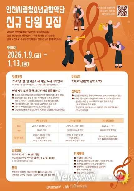 뉴스펀치 김길룡 기자 | 인천광역시 문화예술회관이 2026년 창단 예정인 인천시립청소년교향악단에서 활동할 신규 단원을 공개 모집한다.