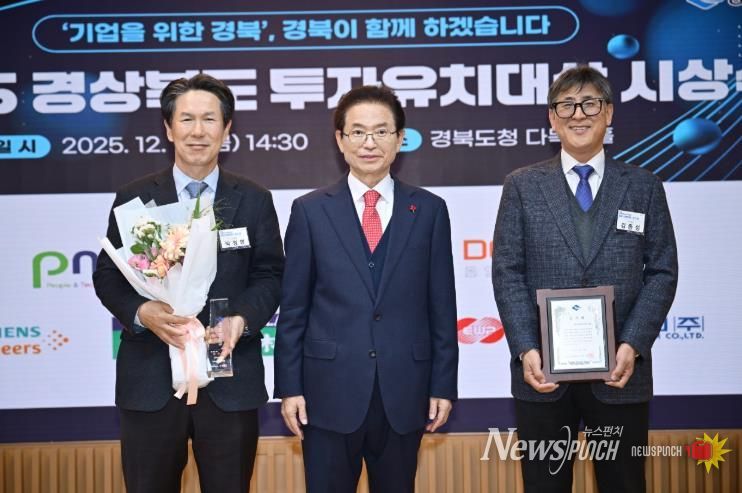 뉴스펀치 김길룡 기자 | 김천1일반산업단지에 입주한 ㈜디알젬(대표 박정병)과 ㈜대림프라콘(대표 김동수)이 지난 19일 경상북도청에서 열린 '2025년 경북 투자유치대상'시상식에서 우수상과 특별상을 수상했다.