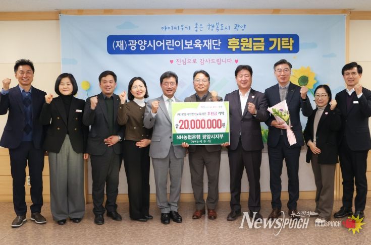 시 관계자는 “오랜 기간 한결같은 마음으로 지역 아이들을 위해 따뜻한 나눔을 실천해 주신 NH농협 광양시지부에 진심으로 감사드린다”며 “이번 기부는 단순한 후원을 넘어 아이 키우기 좋은 광양을 함께 만들어 가겠다는 지역사회의 굳은 약속이자 큰 응원”이라고 강조했다. 이어 “오늘 전달된 소중한 후원금은 아이들의 건강한 성장과 부모님들의 든든한 버팀목이 될 것”이라며 “광양시는 앞으로도 재단과 함께 아이 한 명, 한 명이 소중히 자라날 수 있는 아이 키우기 좋은 도시, 부모가 안심할 수 있는 도시를 만들기 위해 최선을 다하겠다”고 말했다.