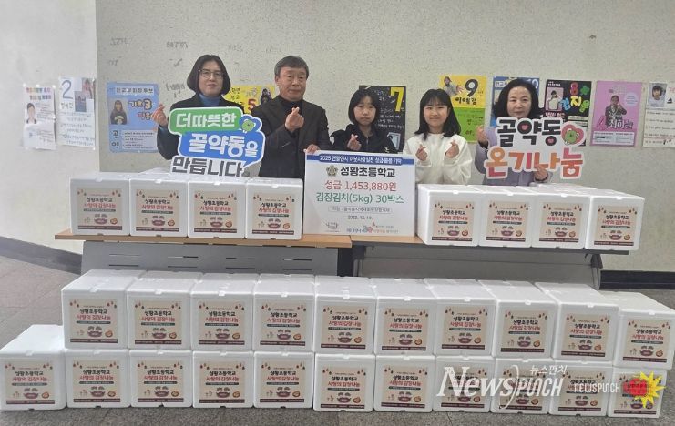 뉴스펀치 김길룡 기자 | 성황초등학교가 지난 19일, 광양시 골약동지역사회보장협의체(공공위원장 박순옥, 민간위원장 정용태)에 학교 나눔 장터 수익금과 김장김치 30박스를 기탁하며 이웃사랑을 실천했다.