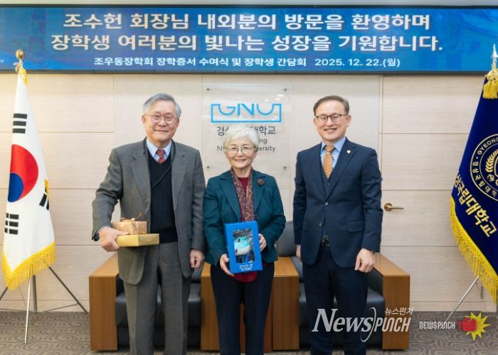 경상국립대학교는 12월 22일 오전 11시 가좌캠퍼스 대학본부 접견실에서 ‘2025학년도 2학기 조우동장학회 장학증서 수여식’을 개최했다.