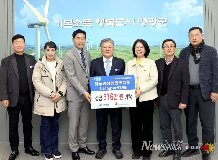뉴스펀치 김길룡 기자 | 영광군은 12월 19일 하누리장애인복지회(회장 남궁경문)에서 이웃돕기 성금 316만 원을 기탁해 희망2026나눔캠페인에 동참했다고 밝혔다.