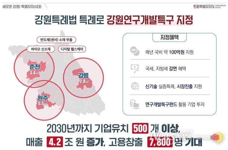 김진태 강원특별자치도지사는 “엄격한 요건으로 시도조차 못했던 불가능이 강원특별법 특례를 통해 가능하게 됐다”며, “춘천, 원주, 강릉을 중심으로 도 전역에서 미래산업이 크게 성장할 것으로 기대된다”고 밝혔다.